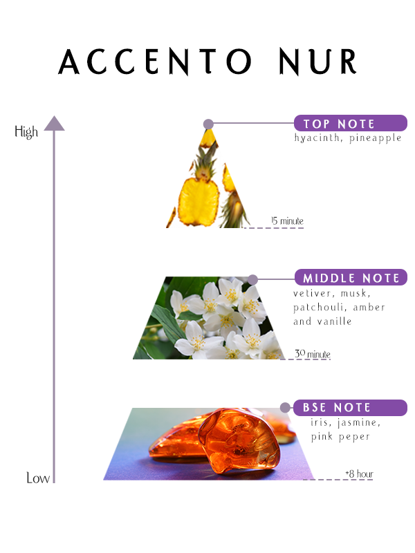 Accento Nur Eau de Perfume is more than a fragrance—it is an expression of radiance, purity, and calm sophistication. It transforms fresh hyacinth, juicy pineapple, elegant florals, and a warm amber vanilla base into a cohesive and unforgettable signature.