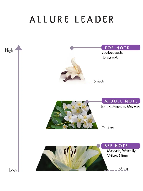 The fragrance settles into a base of bourbon vanilla and vetiver. Bourbon vanilla provides creamy sweetness with velvety allure, while vetiver adds earthy sophistication with grounding richness. This base ensures Allure Leader Perfume lingers with excellent longevity and a smooth, controlled trail.