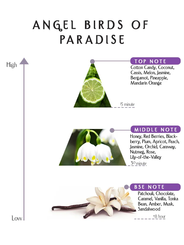 The fragrance opens with cotton candy, coconut, cassis, melon, jasmine, bergamot, pineapple, and mandarin orange. Cotton candy introduces playful sweetness, coconut adds creamy tropical warmth, cassis contributes tart vibrancy, melon enhances freshness, jasmine provides floral refinement, bergamot adds citrus sparkle, pineapple delivers juicy brightness, and mandarin orange completes the opening with radiant clarity. This lively introduction makes Angel Birds Of Paradise Perfume uplifting and invigorating, ideal for daytime wear, festive occasions, and moments where freshness and sophistication are essential.