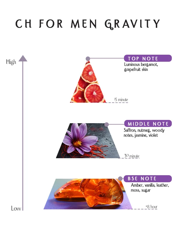 The structure of CH For Men Gravity Eau de Perfume 55 ML demonstrates careful balance between citrus brightness, spicy refinement, floral elegance, and woody depth. The bergamot-grapefruit top notes provide immediate vibrancy, the saffron-jasmine heart adds sophistication, and the amber-leather base ensures lasting presence. This layered progression allows the fragrance to evolve gracefully over time, maintaining interest from the first spray to the final dry-down. Longevity is enhanced by amber and moss, while vanilla and sugar ensure smoothness and comfort.