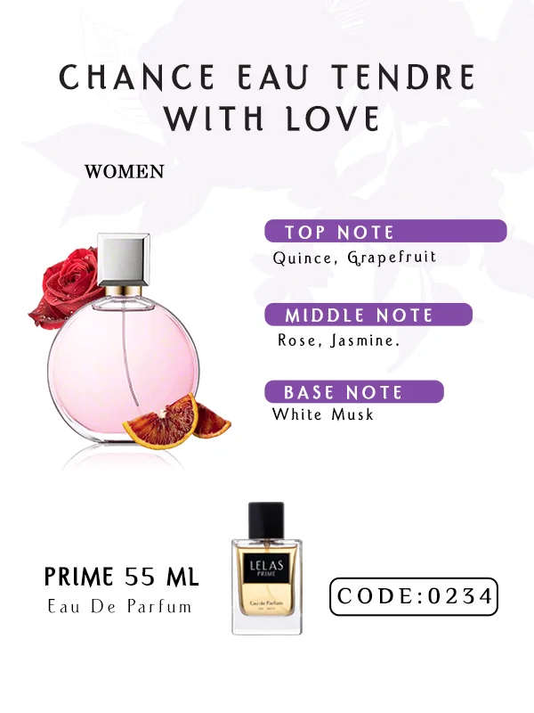Chance Eau Tendre With Love Perfume 55 ML is a fragrance that embodies sophistication, femininity, and timeless allure. Part of the Prime Collection by Perfume File, this Eau de Perfume blends sparkling fruits, refined florals, and a soft musky base into a captivating olfactory journey. It reflects confidence, charm, and irresistible presence, designed for women who embrace elegance and individuality.
