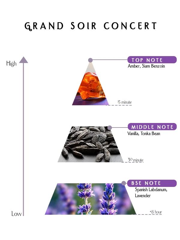The base of Grand Soir Concert Perfume completes the composition with calm refinement and lasting harmony. Tonka bean adds subtle sweetness with a soft almond-like warmth, enriching the base with smooth depth. Lavender introduces aromatic clarity and tranquility, balancing the warmth with freshness and elegance. This foundation leaves a composed and graceful trail that lingers beautifully on the skin.