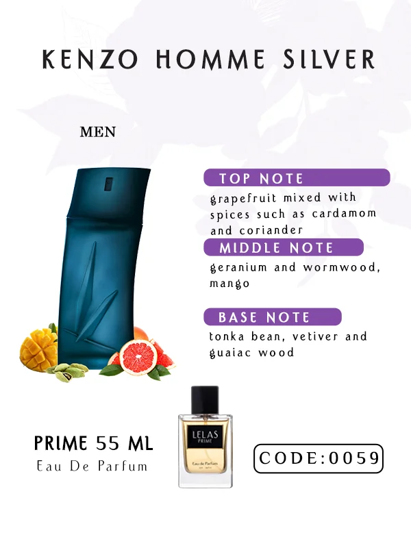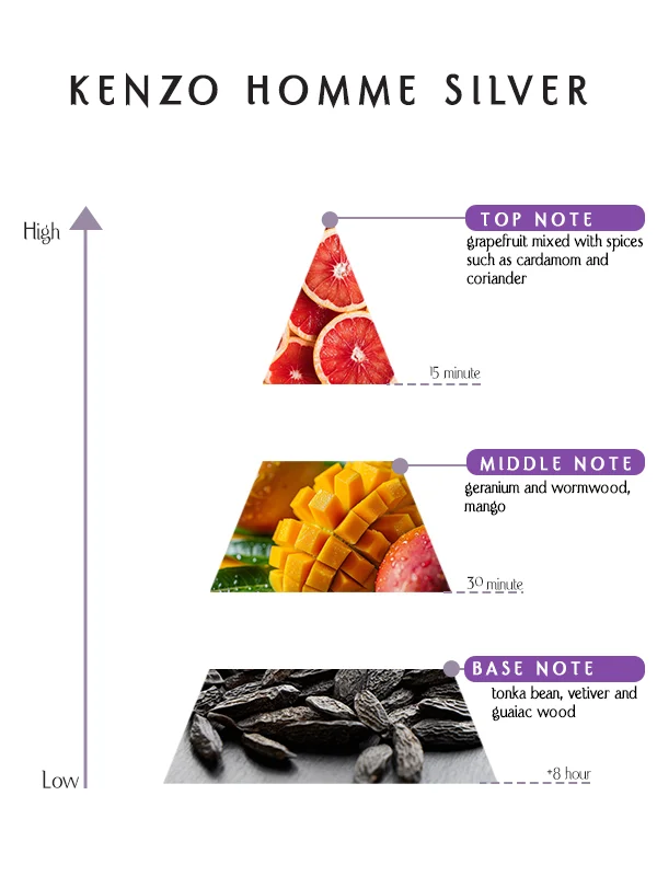 Kenzo Homme Silver Perfume blends grapefruit, cardamom, coriander, geranium, wormwood, mango, tonka bean, vetiver, and guaiac wood for a bold, elegant signature.