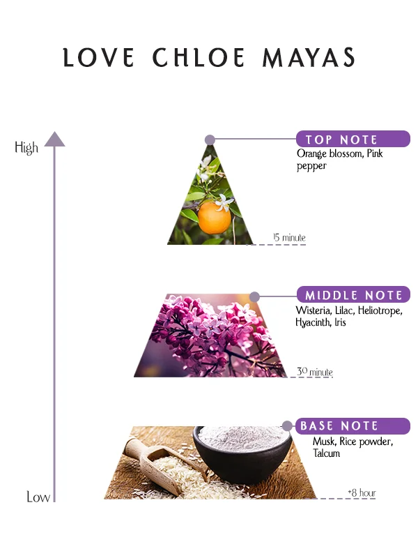 Love Chloe Mayas Perfume blends orange blossom, pink pepper, wisteria, lilac, heliotrope, hyacinth, iris, musk, rice powder, and talcum for a bold, elegant signature.