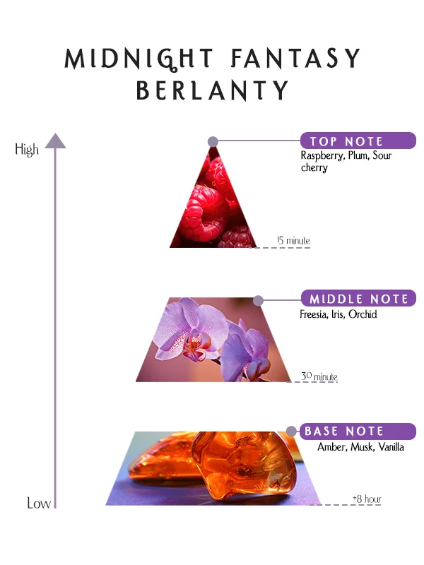 Midnight Fantasy – Berlanty is a playful fragrance that opens with raspberry, plum, and sour cherry, flows into a floral heart of freesia, iris, and orchid, and settles into a sensual base of amber, musk, and vanilla. A sweet, dreamy scent full of charm and allure.