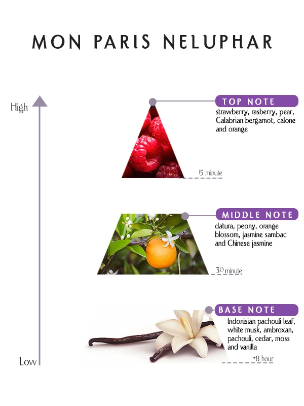 This fragrance is inspired by passionate love and fearless femininity. Mon Paris Nervin Eau de Perfume evolves smoothly on the skin, transitioning from juicy fruity brightness to intoxicating floral richness and finally into a warm, sensual woody base. Its development feels fluid and expressive, reflecting emotion, confidence, and individuality.
