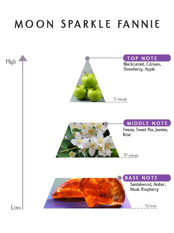 Inspired by timeless charm and refined sophistication, this fragrance transitions from fruity vibrancy to floral refinement and finally into warm sensuality. Moon Sparkle Fannie evolves gracefully, offering a captivating olfactory journey that feels both modern and classic. Its layered development ensures that each stage of the fragrance tells a different story, keeping the wearer engaged and those around them intrigued.