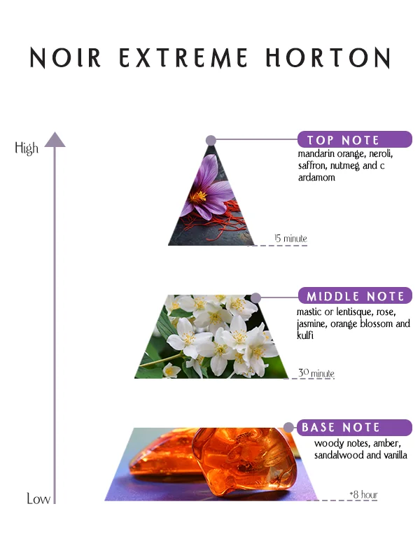This fragrance is inspired by strength expressed through elegance. Noir Extreme Horton Eau de Perfume evolves seamlessly on the skin, transitioning from spicy citrus freshness to exotic floral richness and finally into a warm, woody amber base. Its development feels fluid and controlled, reflecting confidence, depth, and refined masculinity.