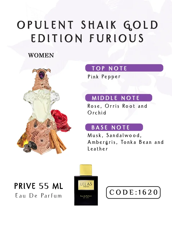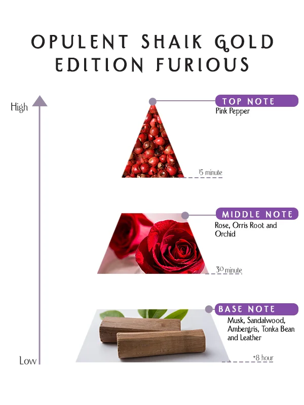 Opulent Shaik Gold Edition Furious Perfume is designed for individuals who express power through elegance and composure. On some skin types, pink pepper and leather dominate with bold intensity; on others, rose, orris root, and sandalwood emerge with refined warmth and depth.
