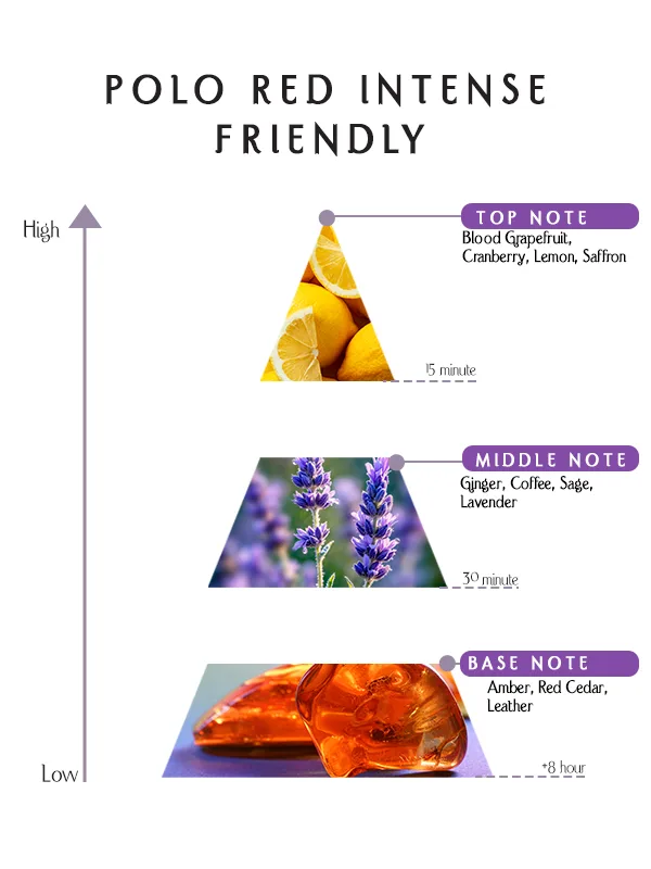 The fragrance opens with blood grapefruit, cranberry, lemon, and saffron. Blood grapefruit introduces juicy tartness with radiant freshness, cranberry adds fruity vibrancy with velvety allure, lemon contributes sparkling citrus clarity, and saffron enhances the fragrance with exotic spice. This powerful opening makes Polo Red Intense Friendly Perfume uplifting and invigorating, ideal for daytime wear, festive occasions, and moments where freshness and sophistication are essential.