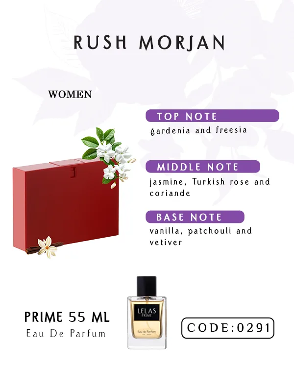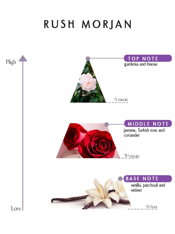 This fragrance is inspired by the idea of presence that lingers. Rush Morjan Eau de Perfume evolves smoothly on the skin, transitioning from luminous floral freshness to rich romantic depth and finally into a warm, earthy base. Its development feels fluid and harmonious, reflecting confidence, elegance, and inner strength.
