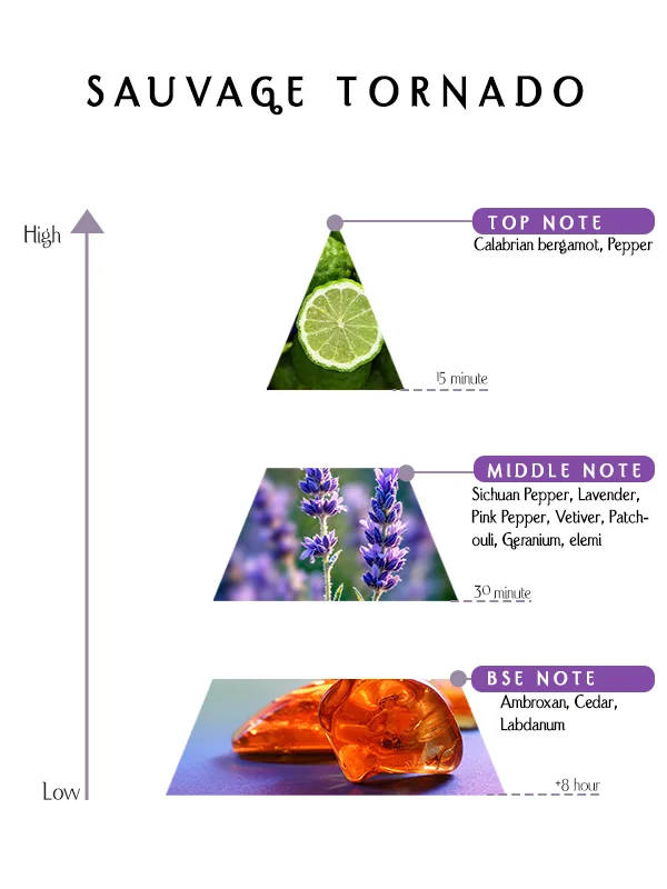 The fragrance opens with Calabrian bergamot and pepper. Bergamot introduces Mediterranean freshness with radiant clarity, while pepper adds spicy vibrancy and magnetic intensity. This lively introduction makes Sauvage Tornado Eau de Perfume uplifting and invigorating, ideal for daytime wear, festive occasions, and moments where freshness and sophistication are essential.