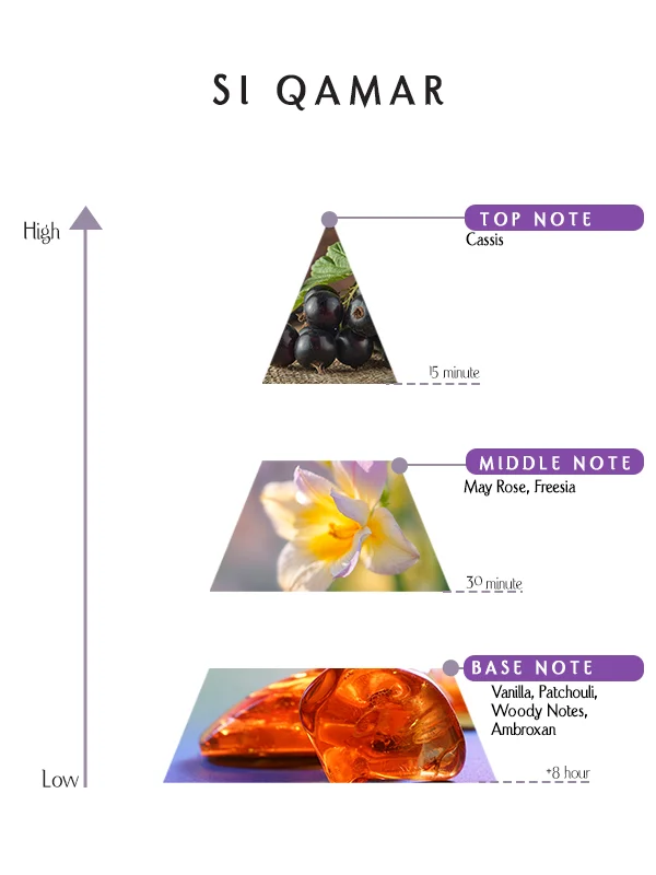 Si Qamar Eau de Perfume is more than a fragrance—it is an expression of romance, elegance, and modern femininity. It transforms luminous fruits, delicate florals, creamy sweetness, and warm musks into a cohesive and unforgettable signature.