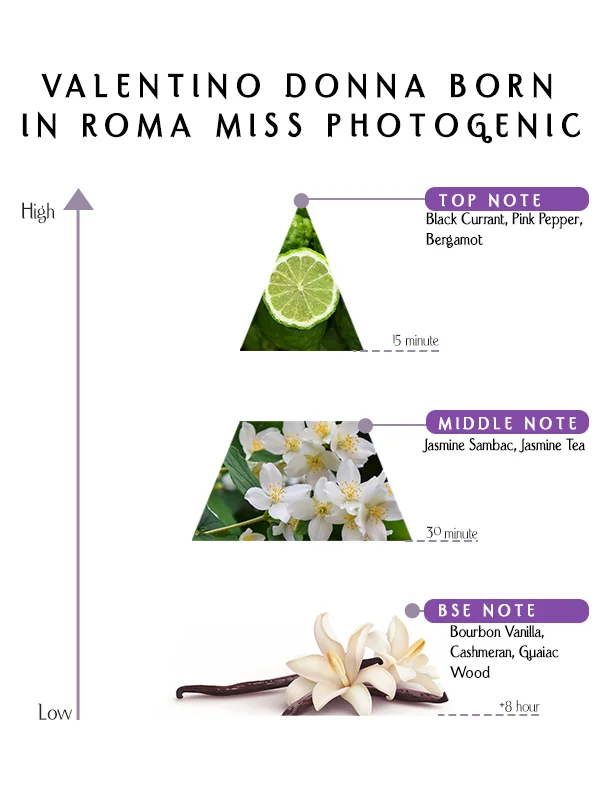 Valentino Donna Born In Roma Miss Photogenic Perfume is designed for women who express confidence through elegance and allure. On some skin types, black currant and bergamot dominate with fruity brightness; on others, jasmine, vanilla, and guaiac wood emerge with deeper sophistication. This variability makes it a fragrance that adapts uniquely to each wearer’s chemistry and personality.