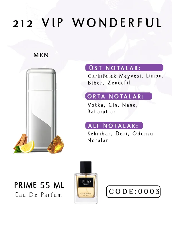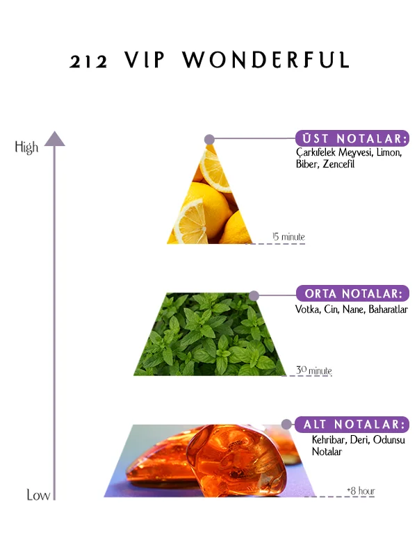 212 Vip Wonderful Eau de Parfum 55 ML, meyvemsi parlaklık, baharatlı incelik ve odunsu derinlik arasında dikkatli bir denge kurar. Çarkıfelek-lime üst notaları canlılık sunar. Votka-nane kalbi sofistike bir dokunuş ekler. Amber-deri tabanı kalıcılığı sağlar. Odunsu akorlar derinliği artırırken amber pürüzsüzlük ve konfor ekler.
