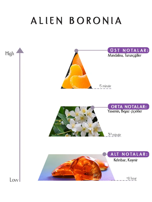 Alien Boronia Perfume, zarif kıyafetler ve özgüvenli bir duruşla doğal uyum sağlar. Narenciye parlaklığı ve çiçeksi cazibesiyle çekiciliği artırır. Galalar, konserler ve unutulmaz geceler için uygundur.