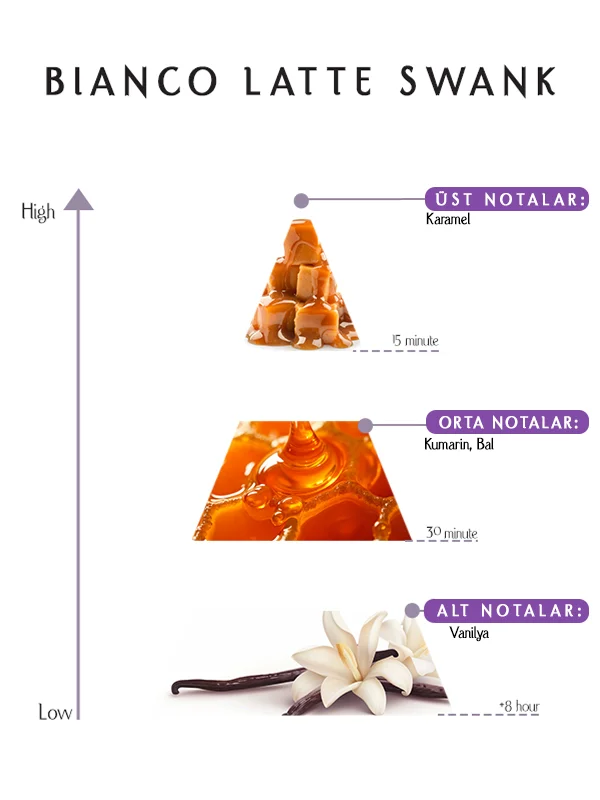 Bianco Latte Swank Eau de Parfum, karamel tatlılığından bal-kumarin kalbine ve sonunda vanilya tabanına akıcı bir geçiş yapar. Gelişimi dengeli ve rahatlatıcıdır; duygusal sıcaklık ve zarif lüksü yansıtır.
