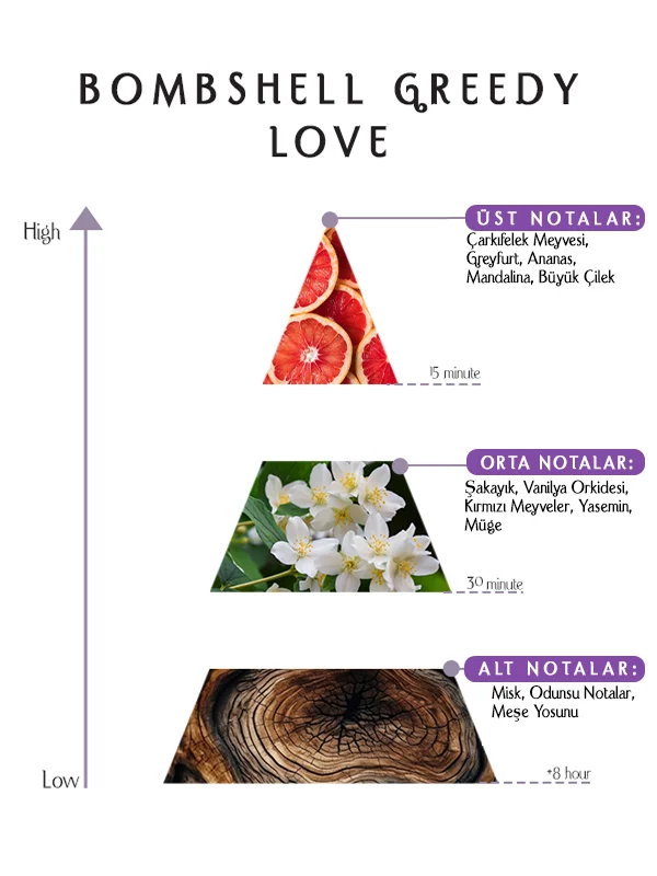 Bombshell Greedy Love Eau de Parfum 55 ML, meyvemsi parlaklık, çiçeksi incelik ve odunsu derinlik arasında dikkatli bir denge kurar. Çarkıfelek-greyfurt üst notaları canlılık sunar. Şakayık-vanilya orkidesi kalbi sofistike bir dokunuş ekler. Misk-meşe yosunu tabanı kalıcılığı sağlar. Bu denge, kokuyu hem günlük kullanım hem de özel davetler için uygun hale getirir.