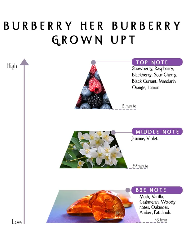 Burberry Her Grown Up Parfüm, zarafet ve bireysellik yoluyla özgüvenini ifade eden kadınlar için tasarlanmıştır. Bazı cilt tiplerinde çilek ve ahududu meyvemsi canlılıkla öne çıkarken; bazılarında menekşe, amber ve paçuli daha derin bir sofistike etki yaratır. Bu değişkenlik, parfümün her kullanıcının kimyası ve kişiliğine özgün bir şekilde uyum sağlamasını mümkün kılar.