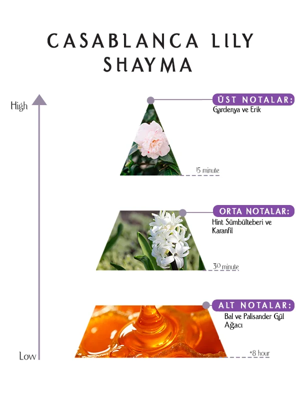 Casablanca Lily Shayma’nın temeli, sıcaklık ve duyusal incelikle kompozisyonu tamamlar. Bal altın bir tatlılık sunar, palisander gül ağacı ise hafif gül alt tonuyla pürüzsüz odunsu bir zenginlik ekler. Bu temel, sıcaklık, cazibe ve rafine zarafetle unutulmaz bir iz bırakır.