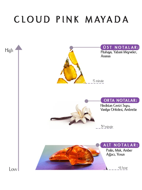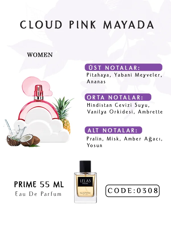 Cloud Pink Mayada Eau de Parfum 55 ML, meyvemsi parlaklık, çiçeksi incelik ve gurme derinlik arasında dikkatli bir denge kurar. Pitahaya-yabani meyveler-ananas üst notaları canlılık sunar. Hindistan cevizi-vanilya kalbi sofistike bir dokunuş ekler. Pralin-misk-amberwood tabanı kalıcılığı sağlar. Amberwood derinliği artırırken pralin pürüzsüzlük ve konfor ekler. Bu denge, kokuyu hem günlük kullanım hem de özel davetler için uygun hale getirir.