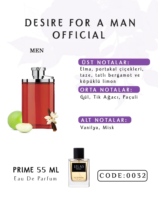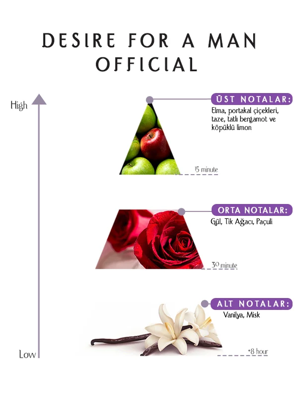 Desire For A Man Official Eau de Parfum 55 ML, narenciye parlaklığı, çiçeksi incelik ve odunsu derinlik arasında dikkatli bir denge kurar. Elma-limon üst notaları canlılık sunar. Gül-paçuli kalbi sofistike bir dokunuş ekler. Vanilya-misk tabanı kalıcılığı sağlar. Paçuli ve tik ağacı derinliği artırırken vanilya pürüzsüzlük ve konfor ekler.