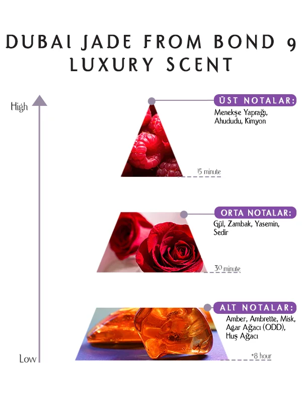 Dubai Jade Luxury Scent Perfume, zarafet ve bireysellik yoluyla özgüvenini ifade eden kişiler için tasarlanmıştır. Bazı ciltlerde menekşe yaprağı ve ahududu ferahlıkla öne çıkarken, bazı ciltlerde amber, oud ve misk daha derin bir sıcaklık ve yoğunlukla hissedilir.