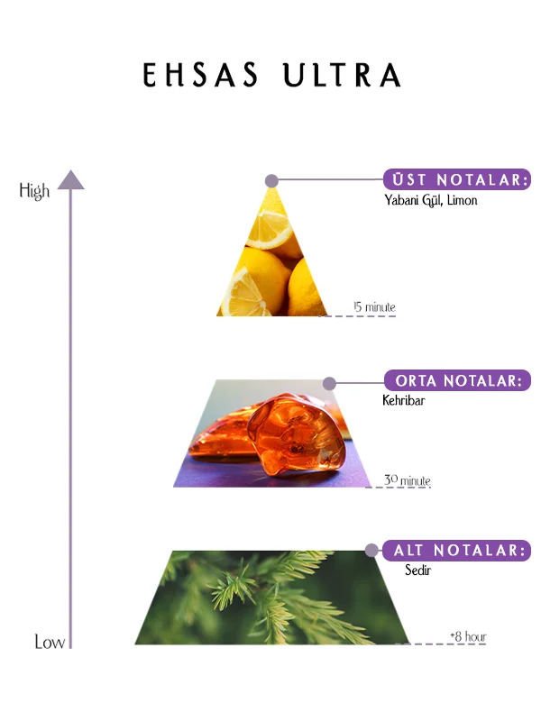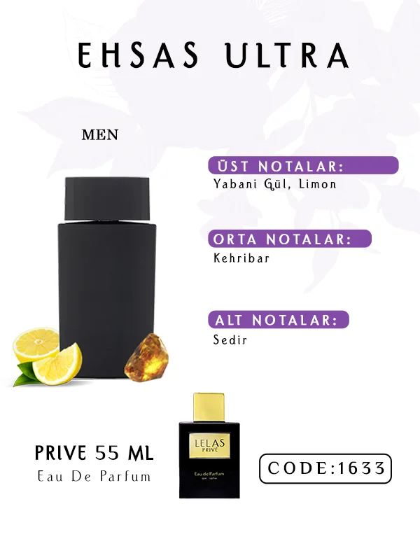 Ehsas Ultra Perfume, gücü sakinlik ve rafinelikle ifade eden erkekler için tasarlanmıştır. Bazı ciltlerde misket limonu ve yabani gül canlı ve ferah kalırken, bazılarında amber ve sedir daha sıcak ve odunsu bir yoğunlukla öne çıkar.