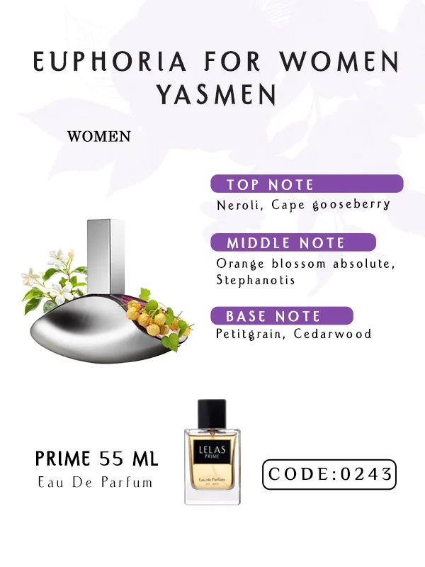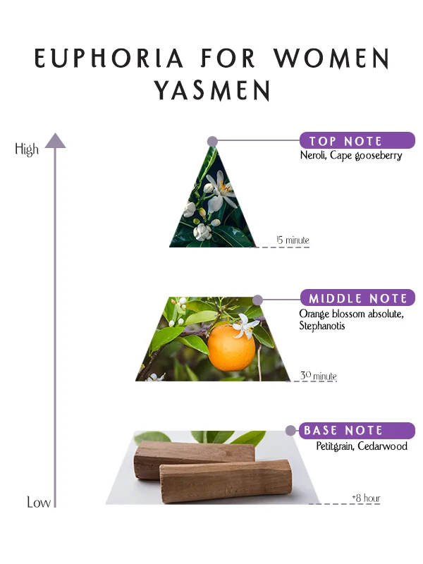 Euphoria for Women Yasmen Perfume, zarif kıyafetler ve özgüvenli bir duruşla doğal uyum sağlar. Narenciye parlaklığı ve çiçeksi cazibesiyle çekiciliği artırır. Galalar, konserler ve unutulmaz geceler için uygundur.