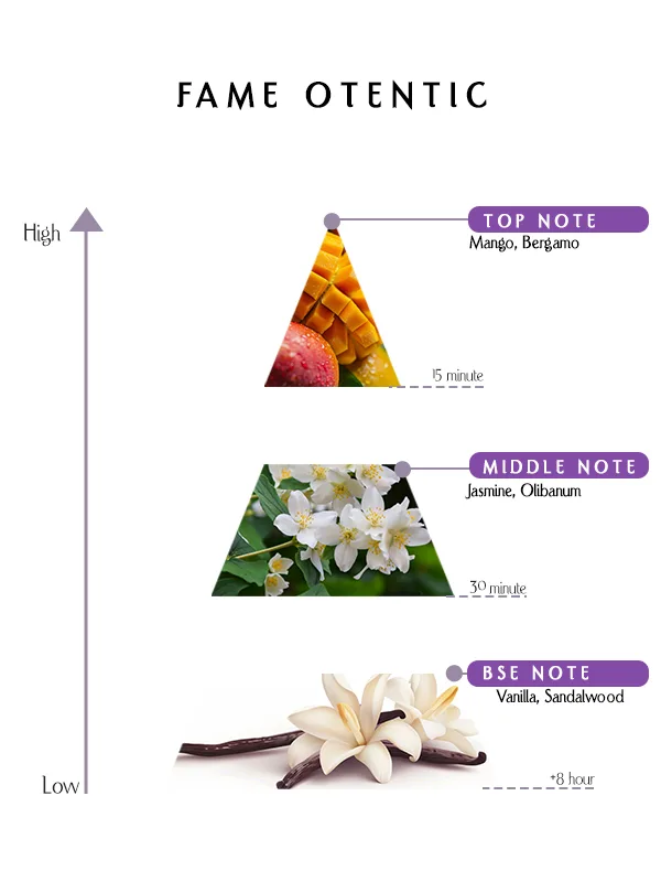 Fame Otentic Parfüm, zarafet ve özgünlük yoluyla özgüvenini ifade eden kadınlar için tasarlanmıştır. Bazı cilt tiplerinde mango ve bergamot meyvemsi canlılıkla öne çıkarken; bazılarında yasemin, vanilya ve sandal ağacı daha derin bir sofistike etki yaratır. Bu değişkenlik, parfümün her kullanıcının kimyası ve kişiliğine özgün bir şekilde uyum sağlamasını mümkün kılar.