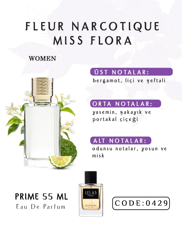 Fleur Narcotique Miss Flora Eau de Parfum 55 ML, modern, ışıldayan ve zahmetsiz zarafeti arayan kadınlar için tasarlanmıştır. Perfume File’ın Prime Koleksiyonu’nun parçası olan bu parfüm; parlak meyveler, rafine çiçekler ve duyusal miskli-odunsu bir tabanı harmanlayarak unutulmaz bir imza sunar. Sabahın enerjisinden akşamın samimiyetine kadar her anla uyum sağlar; daima zarif, daima büyüleyici.