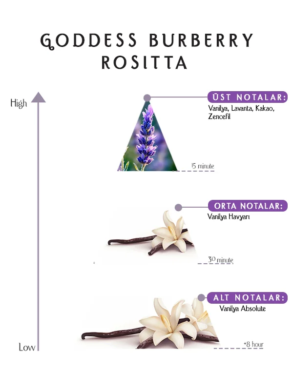 Goddess Burberry Rositta Parfüm, vanilya, lavanta, kakao, zencefil, vanilya havyarı ve vanilya absolüünü harmanlayarak cesur ve zarif bir imza yaratıyor.