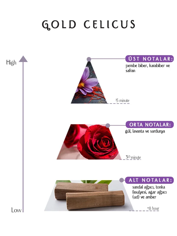Gold Celicus Eau de Parfum 55 ML, baharatlı parlaklık, çiçeksi incelik ve odunsu derinlik arasında dikkatli bir denge kurar. Biber-safran üst notaları canlılık sunar. Gül-lavanta kalbi sofistike bir dokunuş ekler. Sandal-oud tabanı kalıcılığı sağlar. Ambergris ve oud uzun ömürlülüğü artırırken tonka fasulyesi pürüzsüzlük ekler.