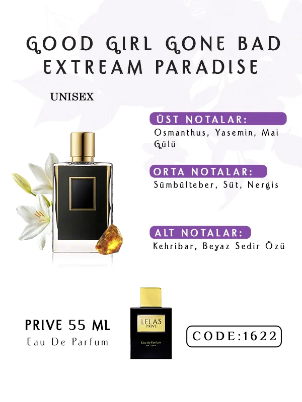 Good Girl Gone Bad Extreme Paradise Eau de Parfum 55 ML, tutkuyu, zarafeti ve zamansız sofistikeliği benimseyen kadınlar için tasarlanmış lüks bir parfümdür. Perfume File’ın Prime Koleksiyonu’nun parçası olan bu koku; çiçeksi parlaklık, kremamsı duyusallık ve odunsu inceliği harmanlayarak büyüleyici bir yolculuk sunar. Cazibe, özgüven ve karşı konulmaz bir varlık yansıtır; zarafet ve farklılık arayan anlar için idealdir.