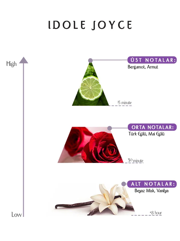 Idole Joyce Parfüm, zarafet ve bireysellik yoluyla özgüvenini ifade eden kadınlar için tasarlanmıştır. Bazı cilt tiplerinde bergamot narenciye canlılığıyla öne çıkarken; bazılarında gül ve vanilya daha derin bir sofistike etki yaratır. Bu değişkenlik, parfümün her kullanıcının kimyası ve kişiliğine özgün bir şekilde uyum sağlamasını mümkün kılar.