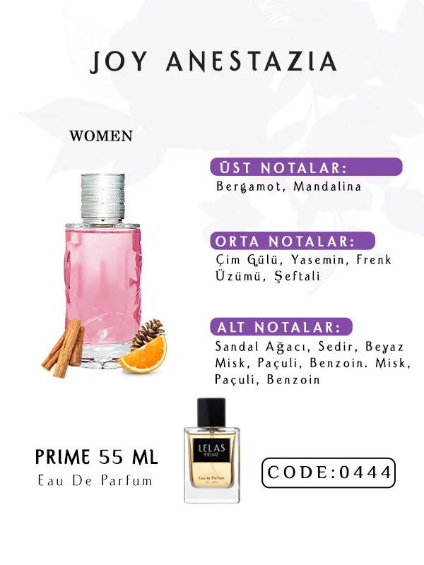 Joy Anstazia Eau de Parfum 55 ML, zarafet ve sofistikeliğin simgesidir. LELAS’ın Prime Koleksiyonu’nun değerli bir parçası olan bu parfüm; parlak narenciye, rafine çiçekler ve sıcak odunsu-miskli bir tabanı harmanlayarak büyüleyici bir koku yolculuğu sunar. Özgüven, cazibe ve karşı konulmaz bir varlık yansıtır; bireyselliğini ve zamansız güzelliğini benimseyen kadınlar için tasarlanmıştır.