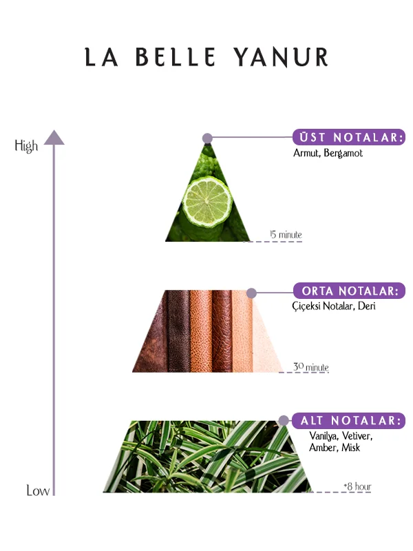Zamansız cazibe ve rafine sofistikeden ilham alan bu parfüm; meyvemsi canlılıktan çiçeksi-deri zarafetine ve sonrasında sıcak duyusallığa geçiş yapar. La Belle Yanur zarif bir şekilde gelişerek hem modern hem de klasik bir koku yolculuğu sunar. Katmanlı yapısı sayesinde her aşama farklı bir hikâye anlatır, kullanıcıyı büyüler ve çevresindekileri etkiler.