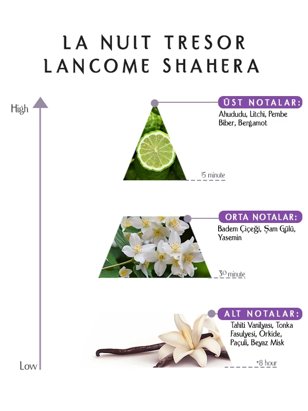 La Nuit Tresor Lancome Shahera Eau de Parfum, farklı cilt kimyalarına uyum sağlayan belirgin bir feminen ve baştan çıkarıcı kimlik taşır. Bazılarında meyvemsi notalar canlı ve eğlenceli kalırken, bazılarında vanilya, tonka fasulyesi ve paçuli daha baskın hale gelir. Akşam kullanımı, romantik anlar ve özel davetler için idealdir.