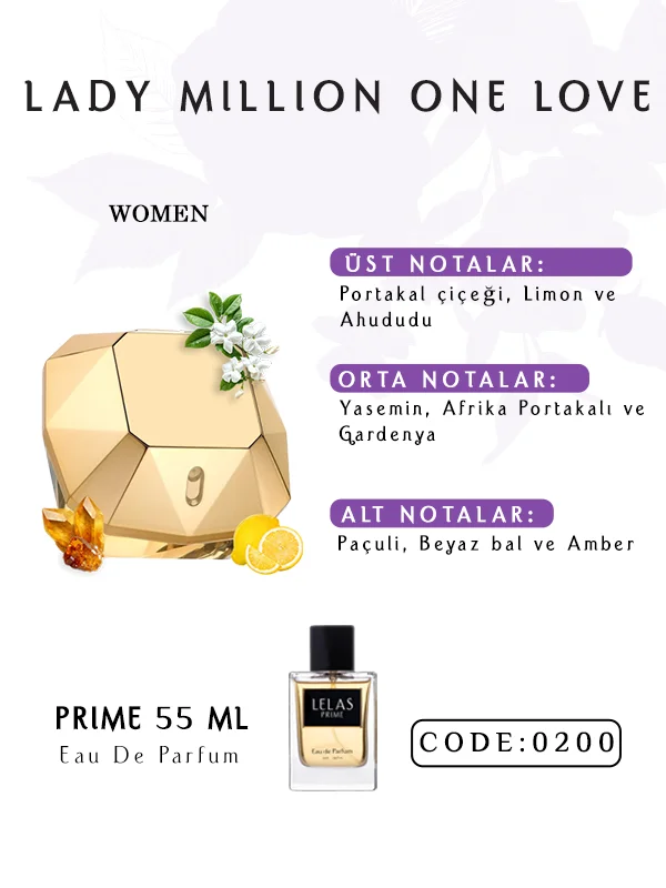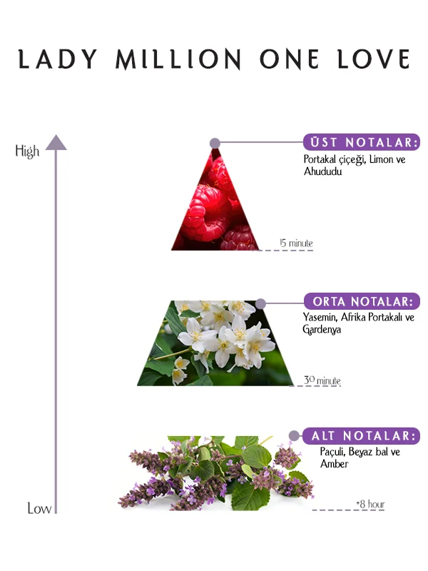 Lady Million One Love Parfüm, neroli, limon, ahududu, yasemin, gardenya, paçuli, bal ve amberin harmanlandığı ışıltılı bir kokudur.