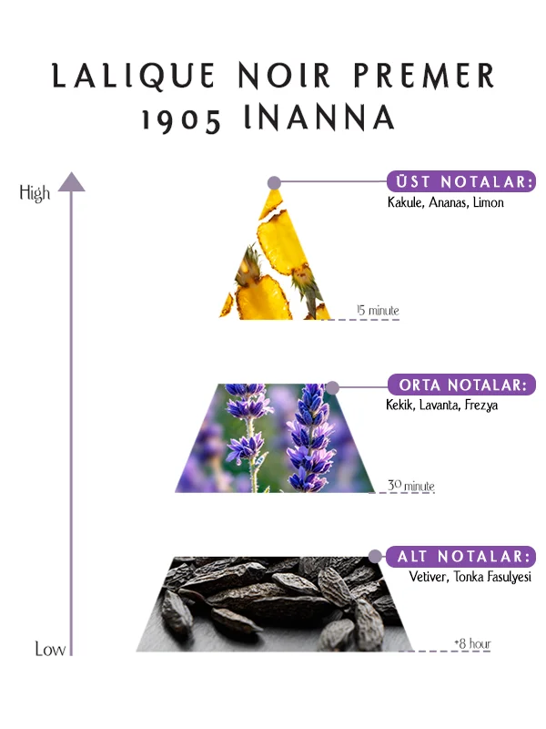 Klasik parfümeri geleneği ve modern sofistikasyondan ilham alan bu koku, tende yavaşça açılarak yumuşak aromatik ferahlıktan pudramsı zarafete, ardından derin ve derimsi bir dip yapıya evrilir. Lalique Noir Premier 1905 Inanna Perfume, kontrollü ve uyumlu bir gelişim sunarak dengeli ve etkileyici bir koku yolculuğu yaratır.
