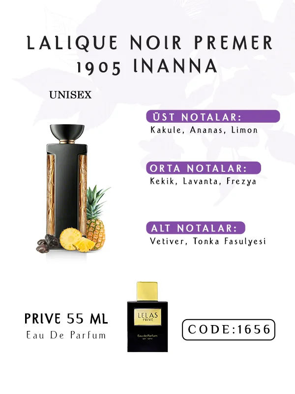 Lalique Noir Premier 1905 Inanna Perfume, özgüveni zarafet ve derinlikle ifade eden bireyler için tasarlanmıştır. Bazı ciltlerde süsen ve pudramsı notalar yumuşaklığıyla öne çıkarken, bazılarında deri ve paçuli daha koyu bir sıcaklık ve yoğunluk sunar.