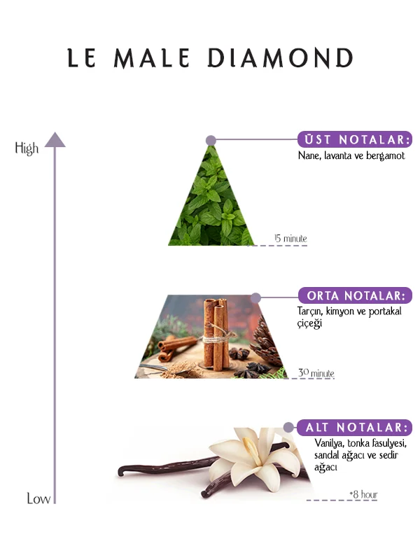 Lüks, cesur ve zamansız bir aromatik-baharatlı-çiçeksi-odunsu imza arayanlar için tasarlanmıştır. Lavanta, tarçın ve vanilyanın dengesi mükemmel bir iz bırakır. Hem güç hem de zarafet sunarak farklı kişiliklere uyum sağlar. Le Male Diamond Perfume 55 ML seçmek, rafine ve sofistike bir kokuyu benimsemek demektir.