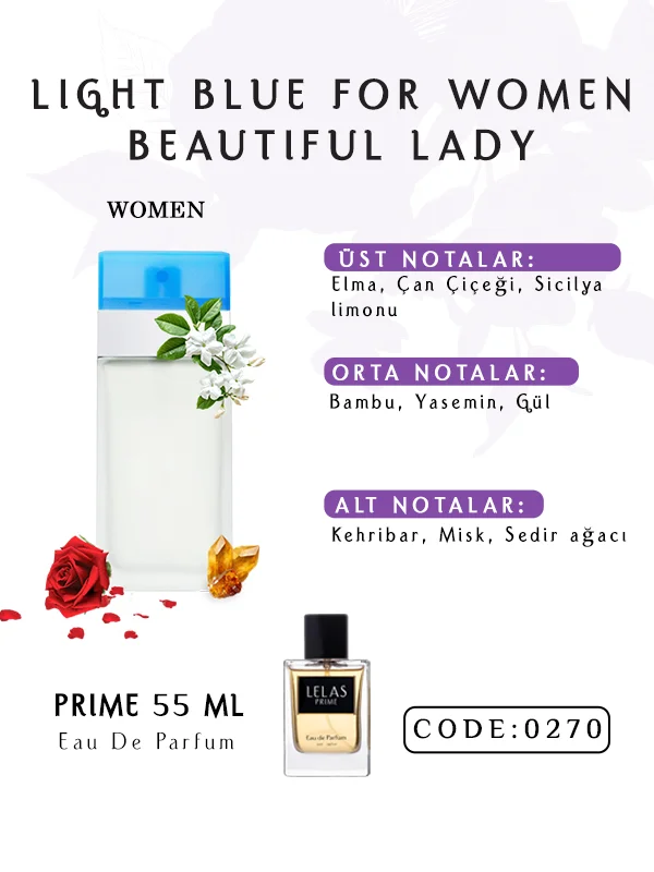 Light Blue For Women Beautiful Lady Perfume 55 ML, zarif kıyafetler ve kendinden emin bir duruşla doğal uyum sağlar.