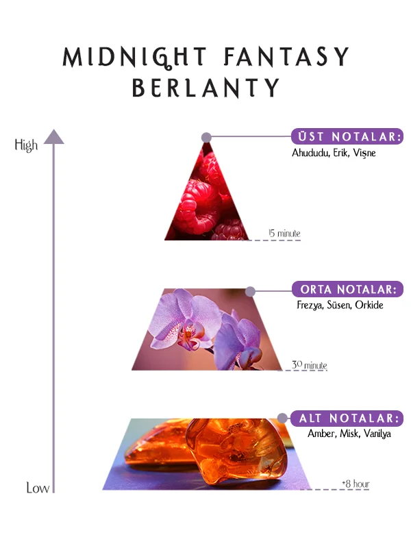 Midnight Fantasy Berlanty Eau de Parfum, tatlılık ve hayal gücüyle özgüvenini ifade edenler için tasarlanmıştır.