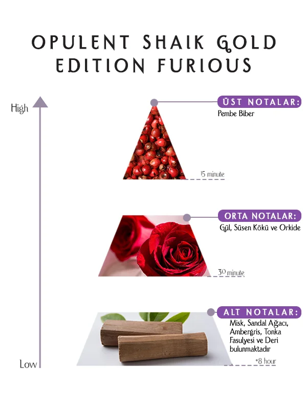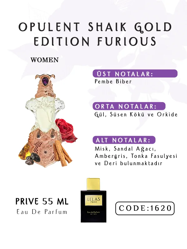 Opulent Shaik Gold Edition Furious Perfume, gücü zarafet ve soğukkanlılıkla ifade eden bireyler için tasarlanmıştır. Bazı ciltlerde pembe biber ve deri cesur bir yoğunlukla öne çıkarken, bazılarında gül, süsen kökü ve sandal ağacı rafine bir sıcaklık ve derinlik sunar.