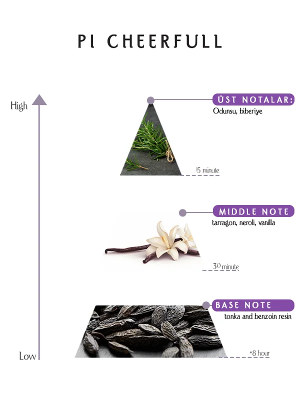 Pi Cheerfull Eau de Parfum 55 ML, odunsu güç, aromatik incelik ve gurme tatlılık arasında dikkatli bir denge kurar. Bitkisel-baharatlı notalar canlılık sunar. Neroli-çiçeksi kalp sofistike bir dokunuş ekler. Vanilya-tonka-benzoin tabanı kalıcılığı sağlar. Benzoin ve odunsu akorlar uzun ömürlülüğü artırırken vanilya pürüzsüzlük ve konfor ekler.