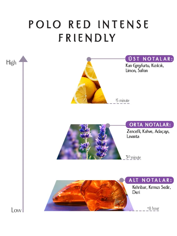 Sonuçta, Polo Red Intense Friendly Eau de Parfum 55 ML sadece notaların birleşimi değil, modern bir maskülen hikâyedir. Narenciye açılışı heyecan verir, aromatik kalbi büyüler, odunsu-deri tabanı ise sessiz bir güvenle kalıcı olur. Zahmetsiz zarafeti yansıtan bir imza parfüm arayanlar için mükemmel bir seçimdir.