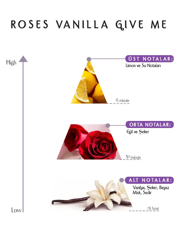 Roses Vanilla Give Me Parfüm, limon, su notaları, gül, şeker, vanilya, beyaz misk ve sedir kokularını harmanlayarak ışıltılı ve zarif bir imza kokusu yaratır.