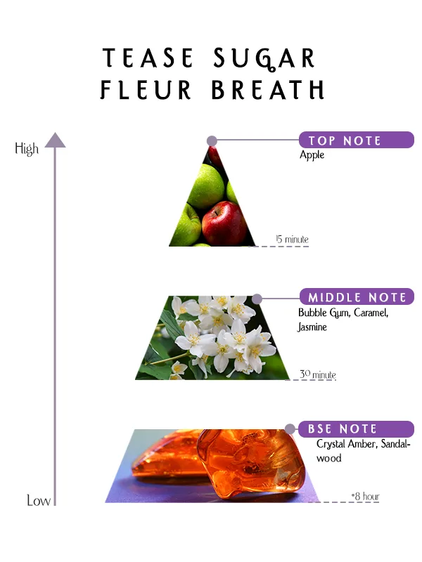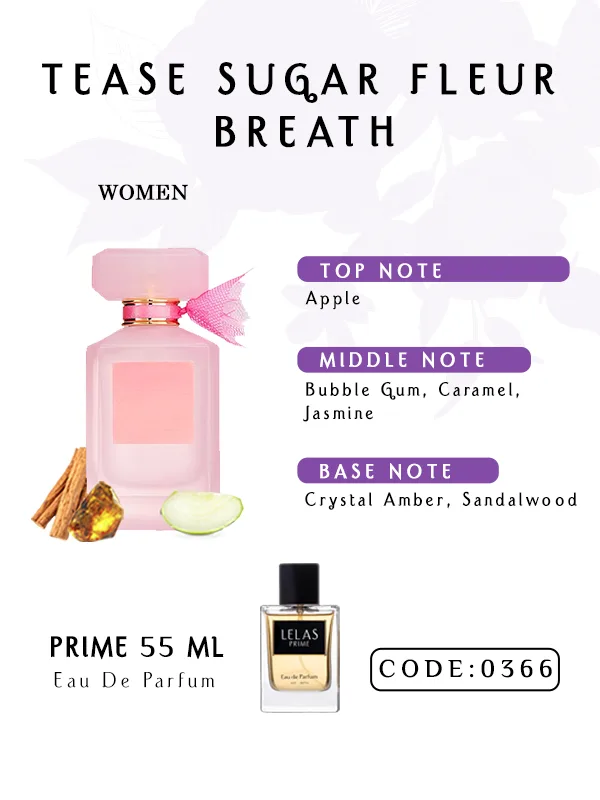 Tease Sugar Fleur Breath Eau de Parfum 55 ML, meyvemsi parlaklık, gurme tatlılık ve çiçeksi incelik arasında dikkatli bir denge kurar. Elma üst notası canlılık sunar. Sakız-karamel-yasemin kalbi sofistike bir dokunuş ekler. Amber-sandal tabanı kalıcılığı sağlar. Bu denge, kokuyu hem günlük kullanım hem de özel davetler için uygun hale getirir.