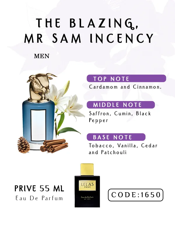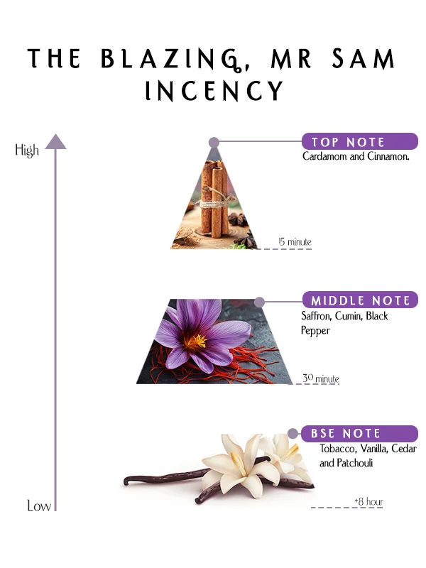 The Blazing Mr Sam Incency Perfume, gücü sakin bir otoriteyle ifade eden erkekler için özel olarak tasarlanmıştır. Bazı ciltlerde kakule ve tarçın aromatik sıcaklıkla öne çıkarken, bazılarında tütün, vanilya ve paçuli daha derin ve duyusal bir yoğunluk sunar.